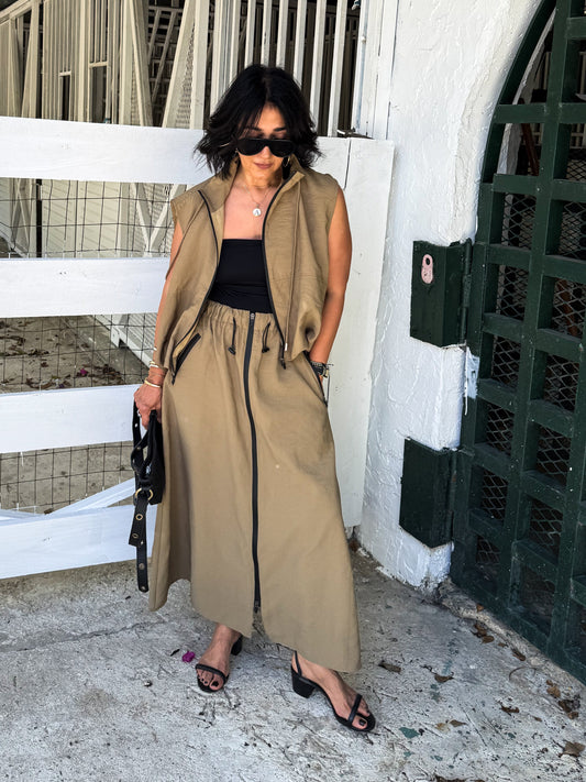 Khaki Zipper-Detail Skirt & Vest Set
