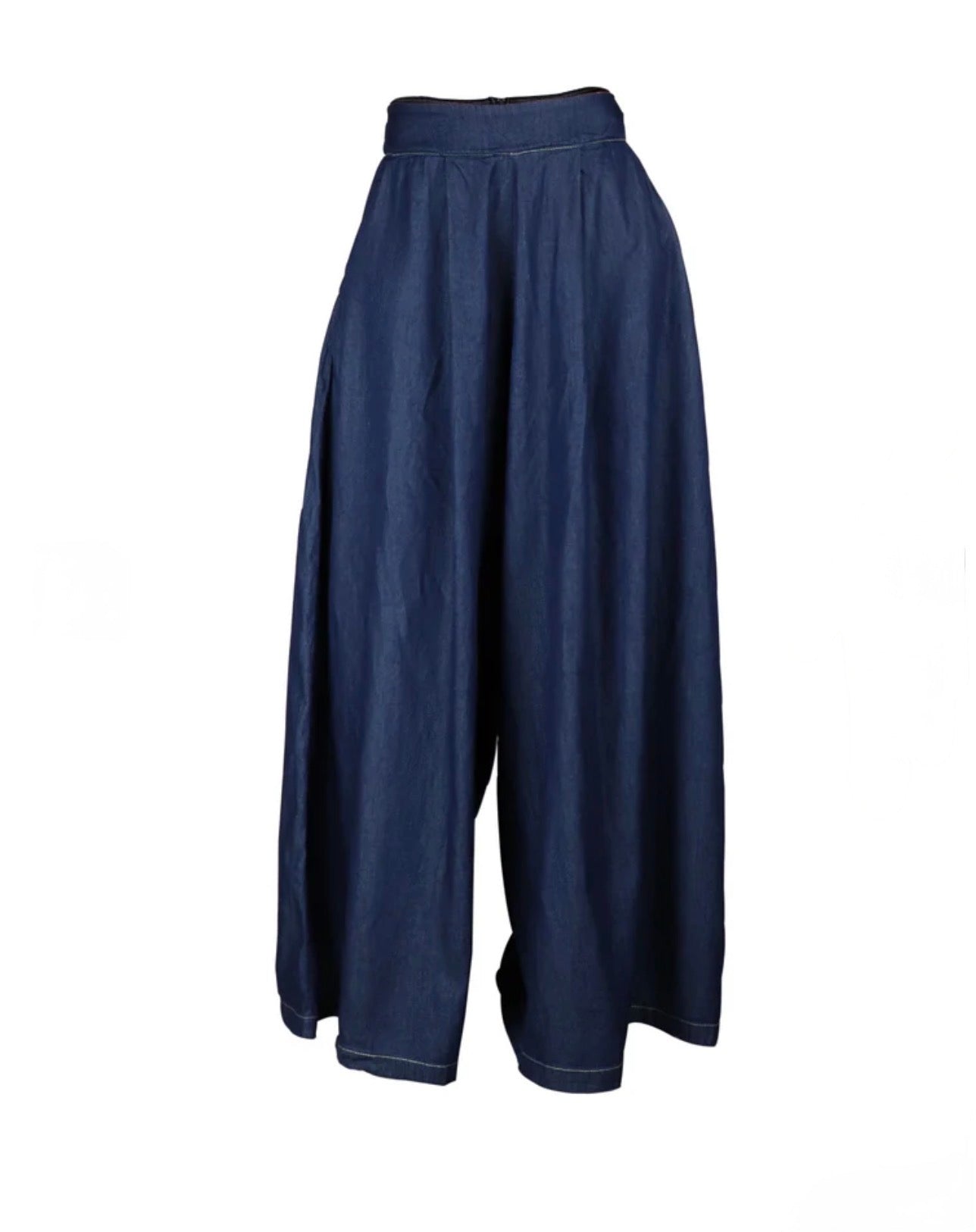 Indigo palazzo pants with functional side pockets. Their wide, high-waisted silhouette makes them a practical piece for everyday wear, the office, or casual outings.