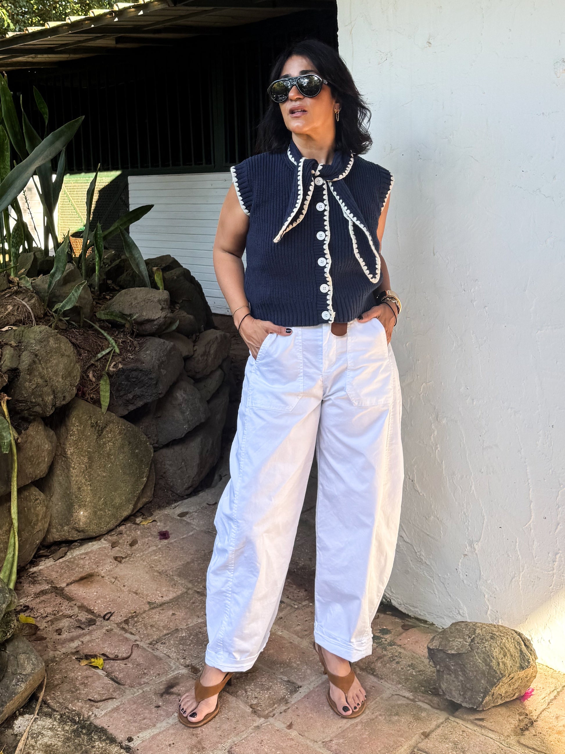 - Tying neck sweater vest with contrast blanket triangle stitch